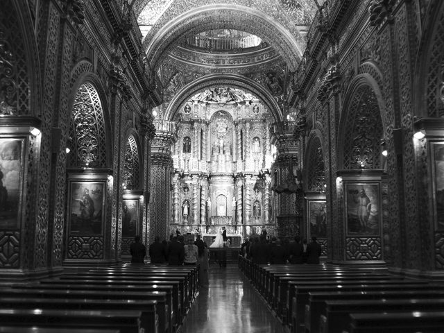 Couple exiting La Compañía de Jesús church in Quito Ecuador at night after their wedding ceremony