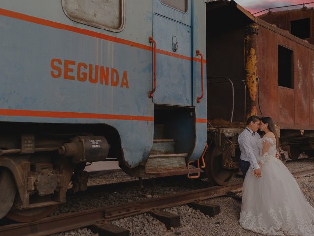 Couple embracing near a train at Tres Centurias Park in Aguascalientes Mexico showing contrast between industrial elements and human connection