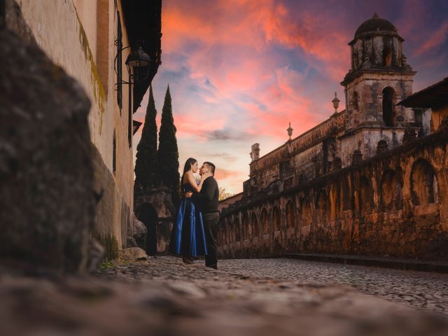 Romantic couple embracing at sunset under arches in Pátzcuaro Mexico during a destination wedding