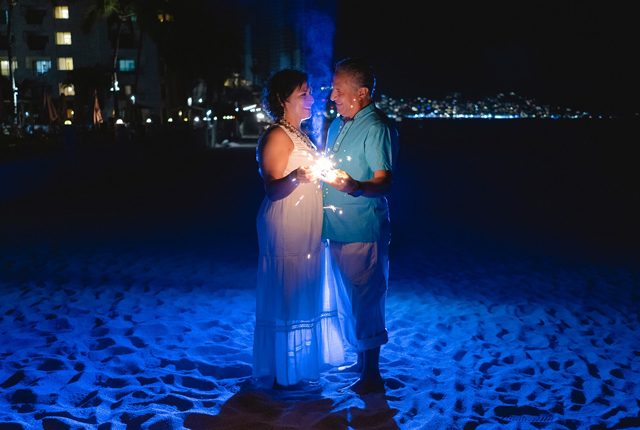 Editorial couple portrait at sunset in Sayulita Mexico using colored lighting and flash photography